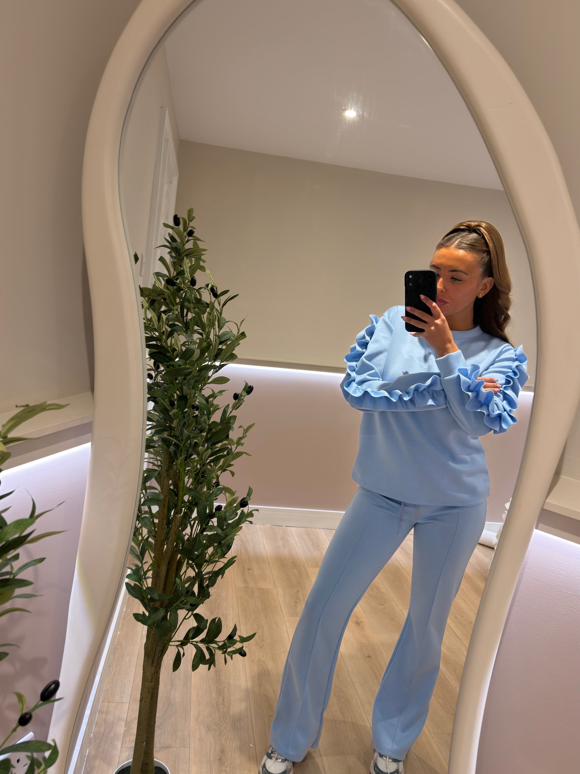 Introducing our ADDY lounge set, a stylish light blue matching set. The outfit features ruffle detailing along the sleeves, paired with drawstring lounge pants, creating a cozy yet trendy look. This is one size 8-12.