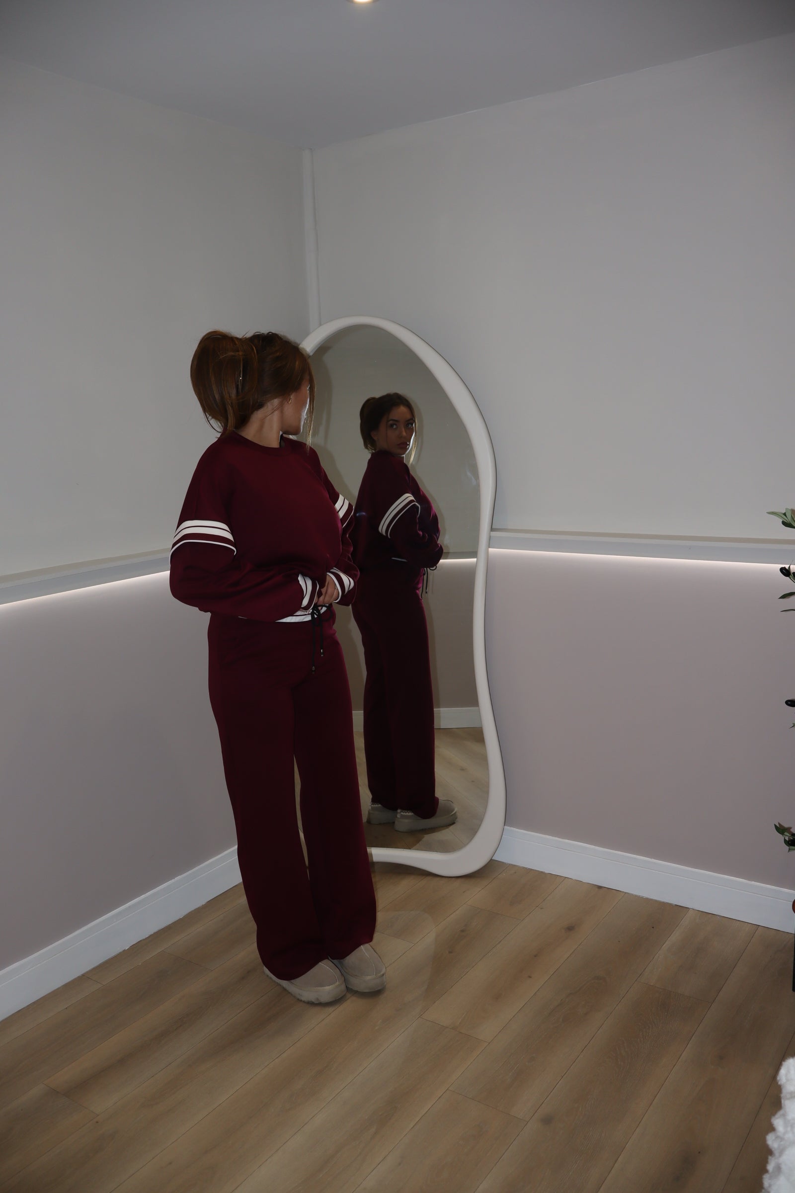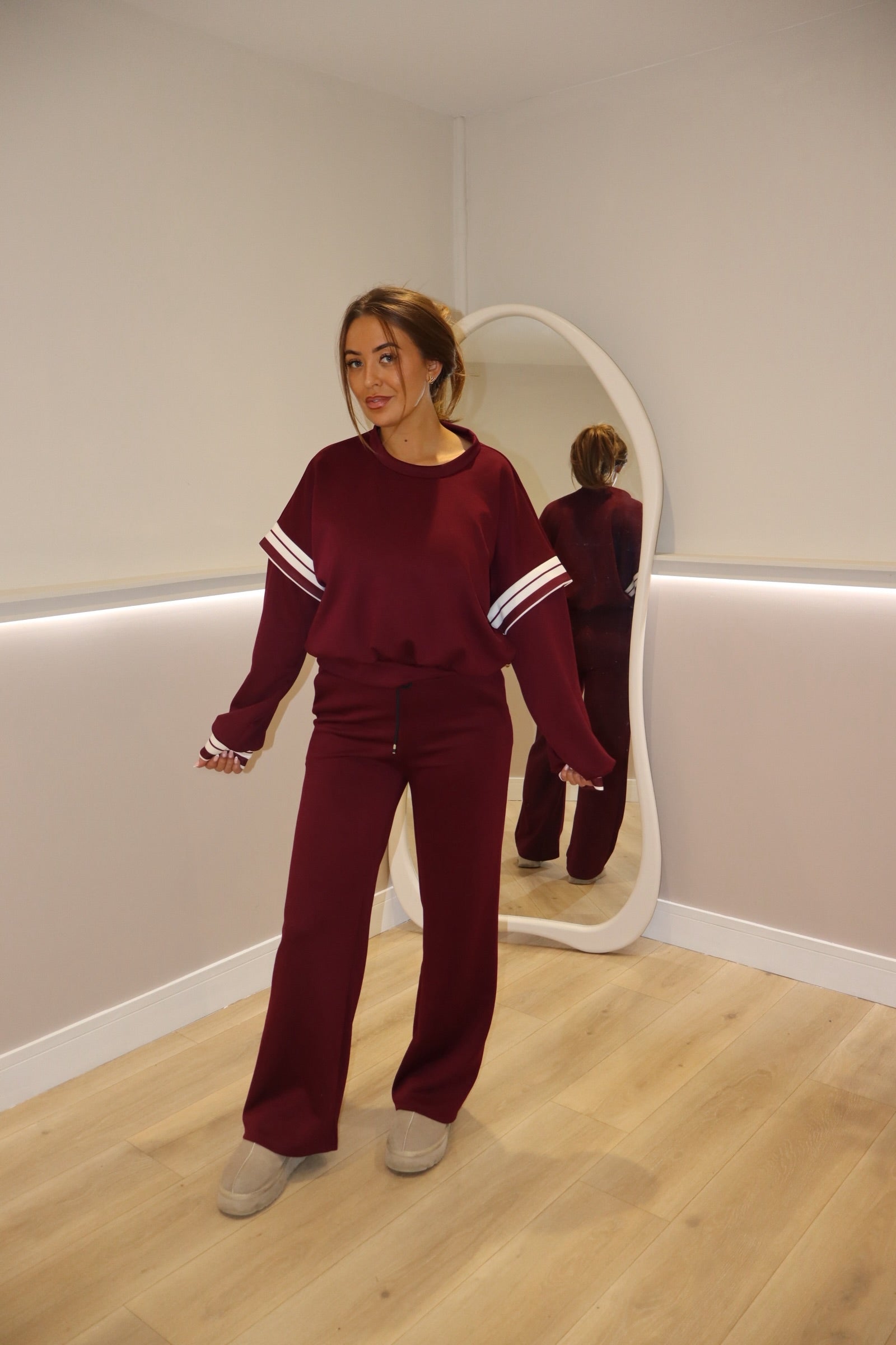 Relax in style with our Bordeaux Lounge Co ord, where comfort meets effortless sophistication. Crafted in a rich wine, burgundy colour. THE COLOUR OF THE SEASON!!, this two piece set combines a relaxed fit sweatshirt with matching wide leg trousers for the ultimate off duty look. The soft, premium fabric drapes beautifully, while the double white stripe detail on the sleeves adds a touch of sport.