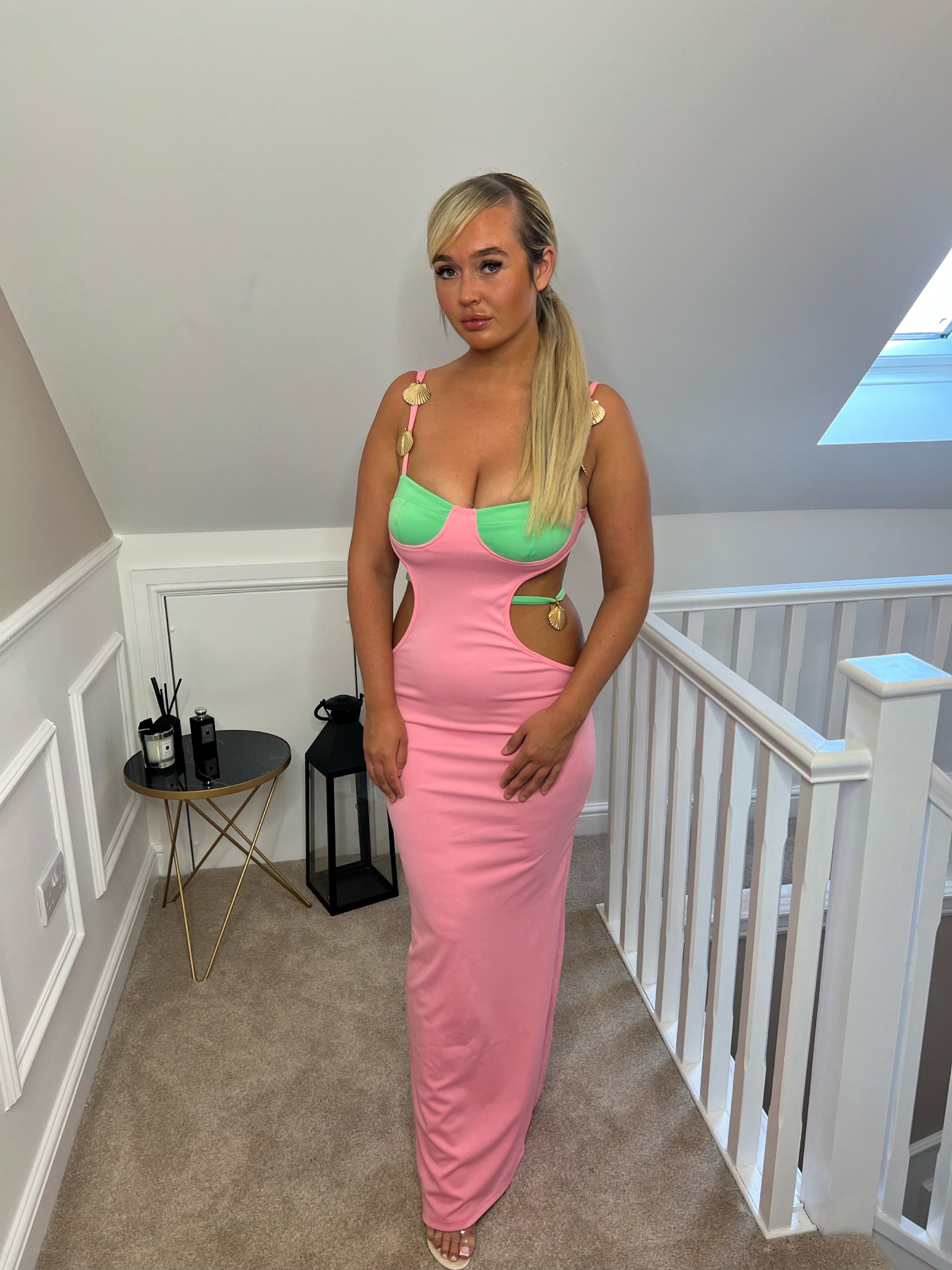 The CHLOE with a floor-length silhouette, this dress is likely to create a dramatic and sophisticated appearance. The pink and green color combination can create a vibrant and unique contrast, adding a sense of freshness and individuality to your outfit.The cut-out sides add a contemporary and playful element to the overall look, while the gold shell details provide a luxurious and eye-catching accent.