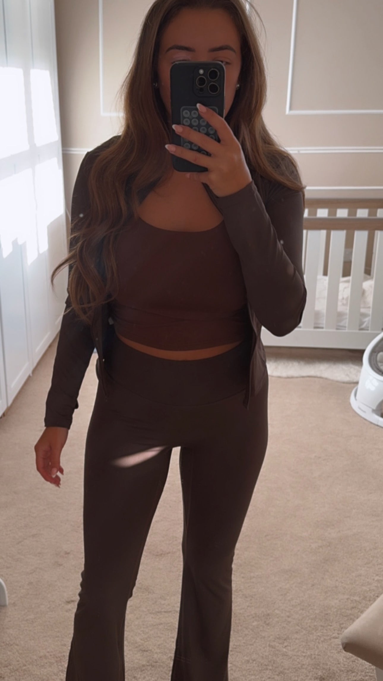 The Chocolate co-odd is a two piece trouser and jacket set which has a rouched bum, flared bottoms and a thick waist band.