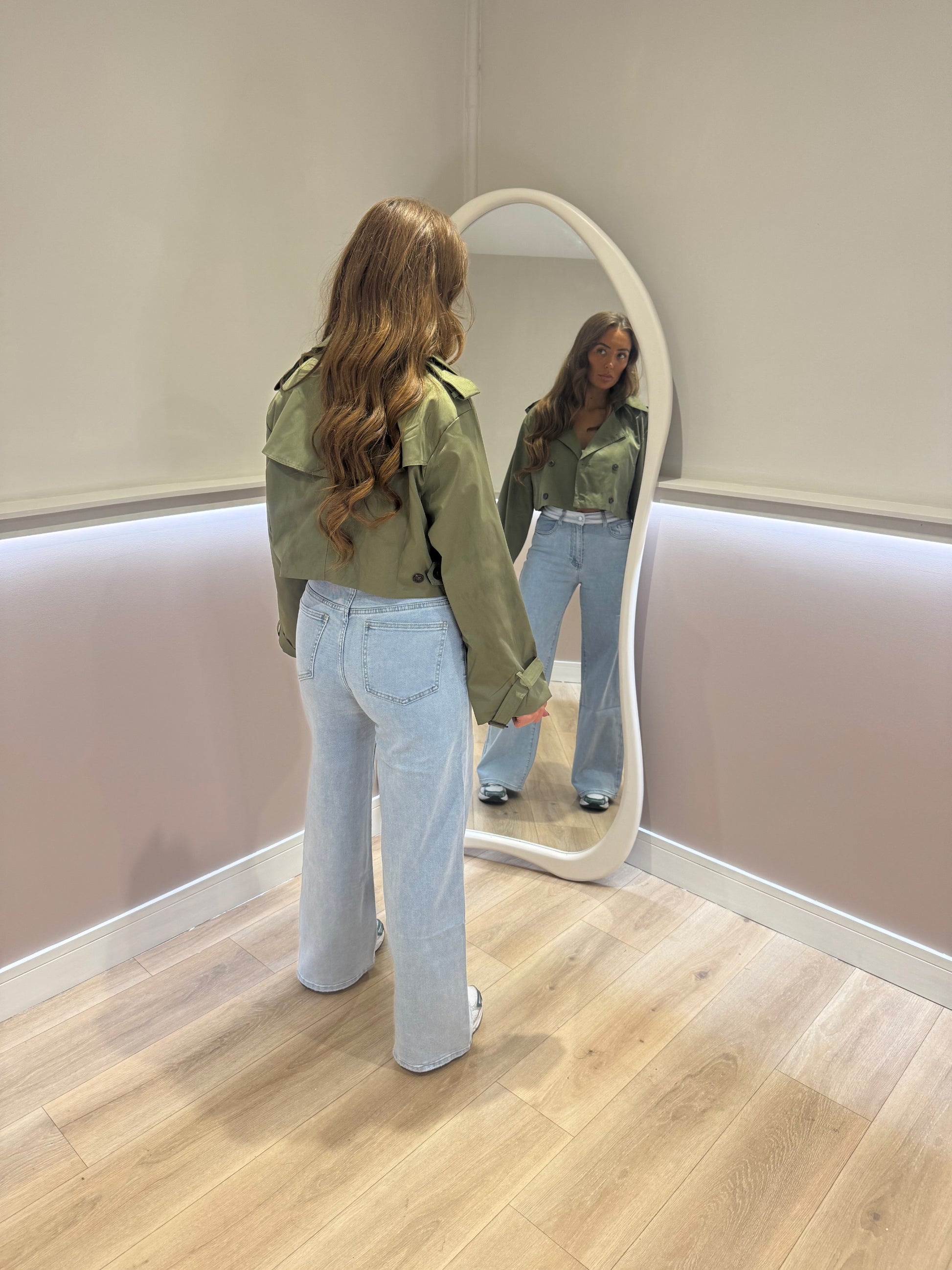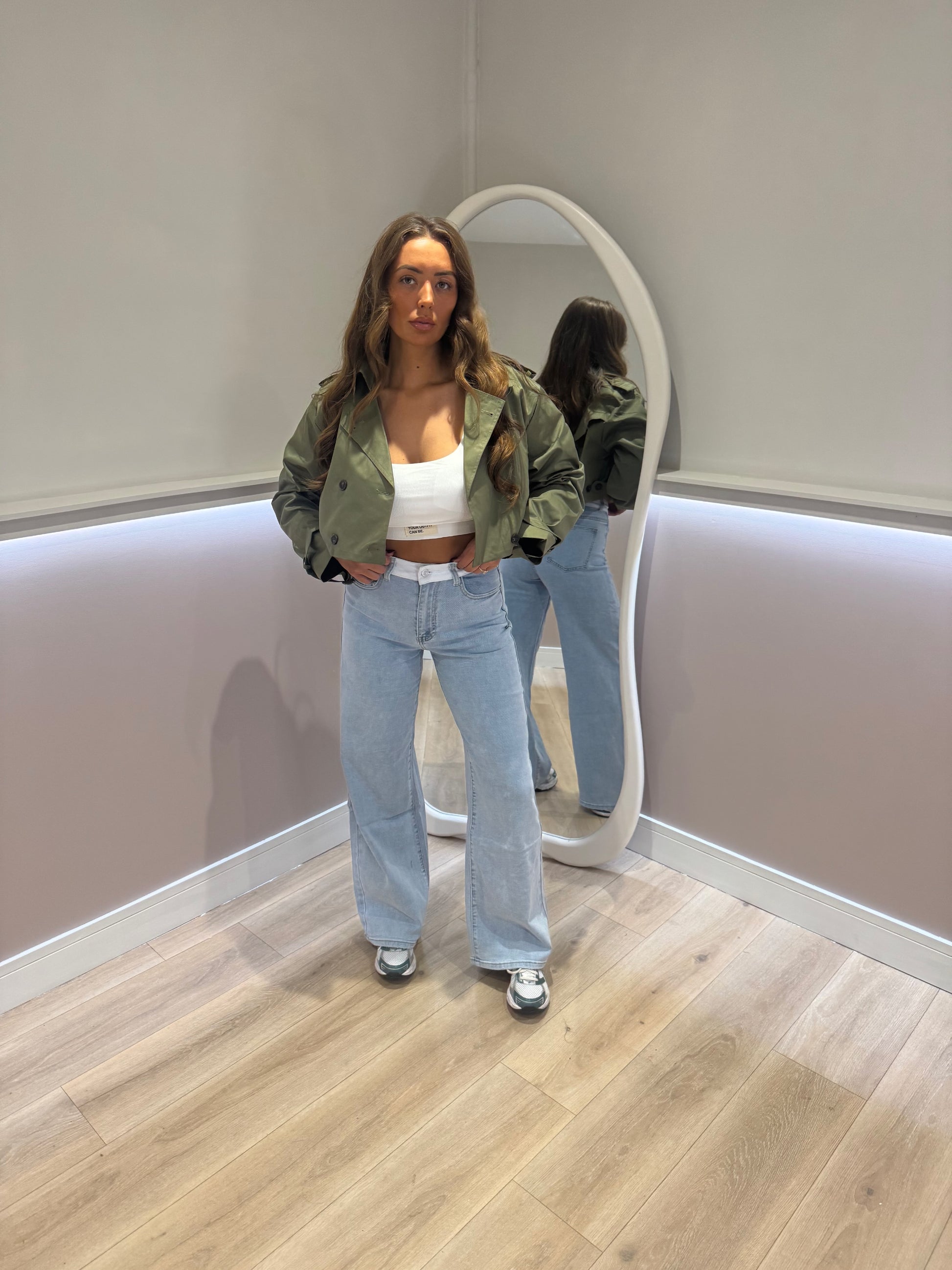 A modern twist on a timeless classic. This cropped boxy trench coat in rich khaki brings effortless edge to any outfit. Designed with sharp tailoring and a relaxed silhouette, it’s the perfect layering piece to elevate casual looks or add structure to evening ensembles. Chic, versatile, and fashion forward. This is a must have staple for every wardrobe.