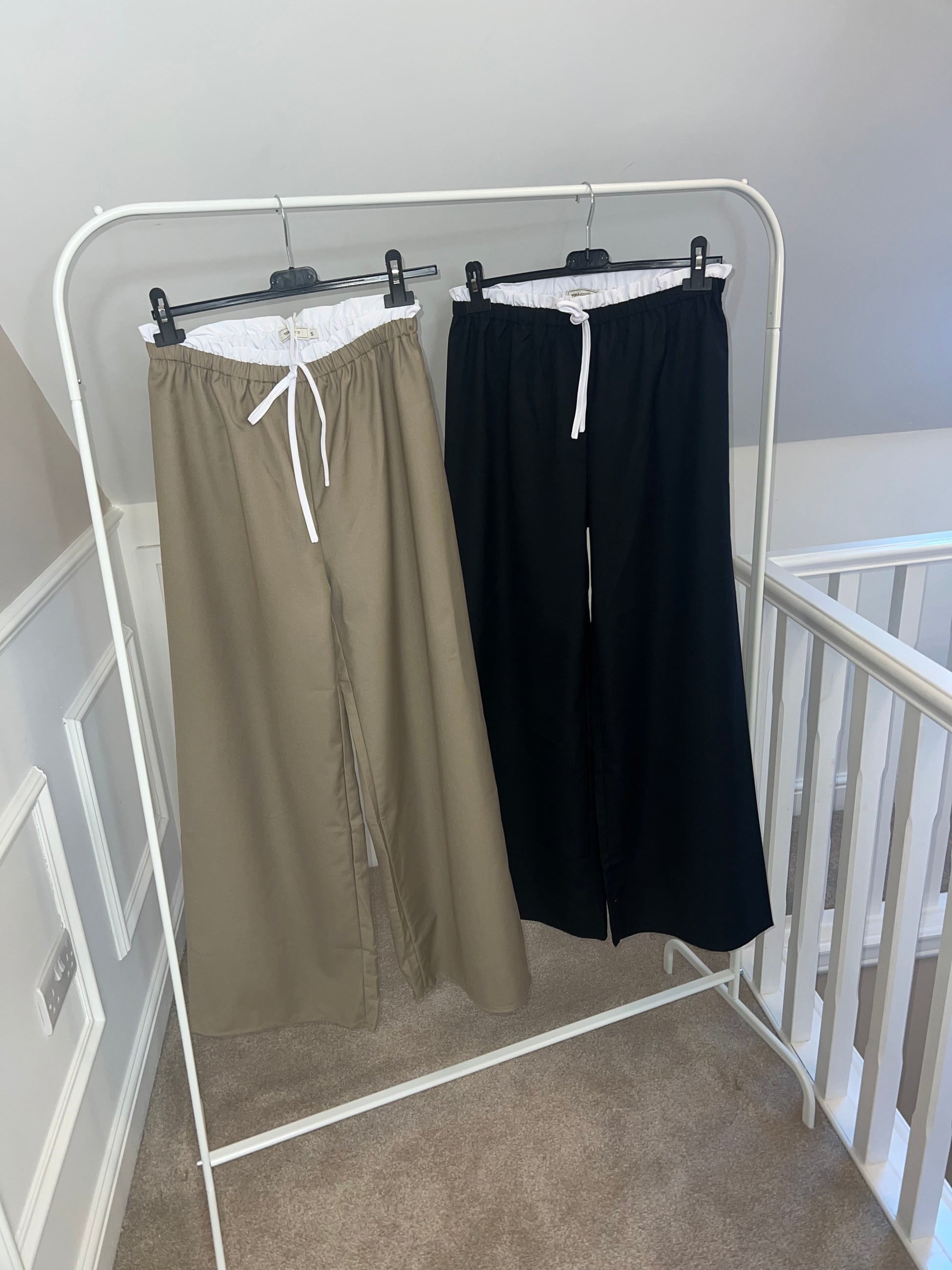 Our Mya wide leg trousers are a perfect fit for any occasion wether you want to keep them casual as a ‘jogger’ type or dress them up for a night out they’re the most flatting material with white detail on the waist band. These range from a size 6/8 to 12/ small 14.